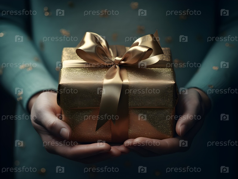 Золотой подарок с лентой в руках у девушки в зеленом платье. Вручение подарка