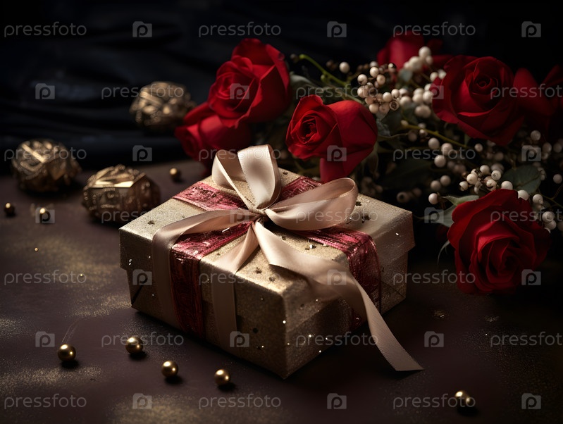 Подарочная коробка с лентой и цветами розами