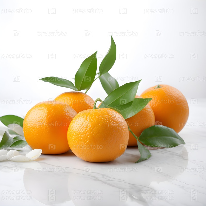 Апельсины с зелеными ветками на белом мраморном столе