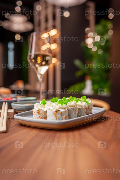 Суши-ролл со сливочным сыром, кунжутом и зеленой икрой летучей рыбы