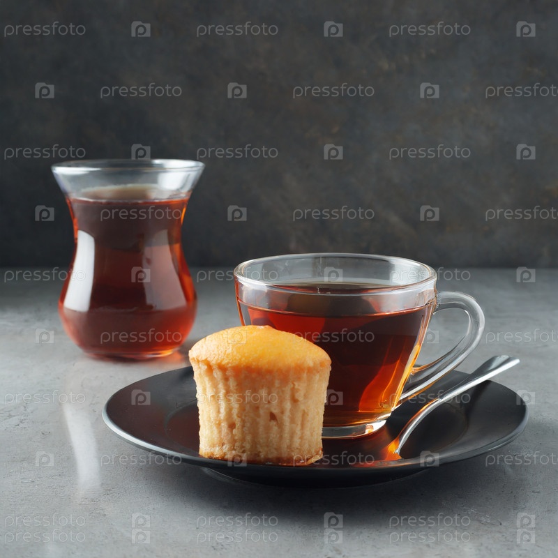 Черный чай и торт на тарелке