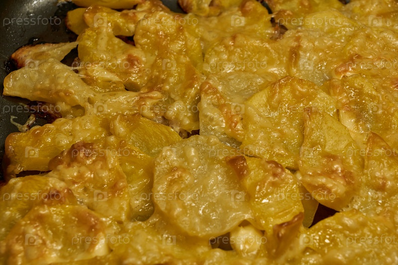 Запеченные ломтики картофеля с сыром в духовке. Крупный план