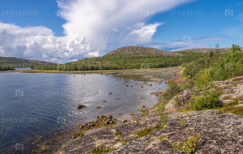 Пейзаж побережья острова Кузов, голубое небо, облака. Кузовский архипелаг, Белое море, Россия