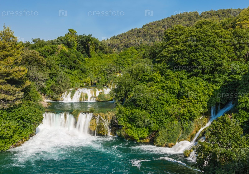 Каскадные водопады Крка в лесу в солнечный день. Национальный парк КРКА Хорватия, Европа