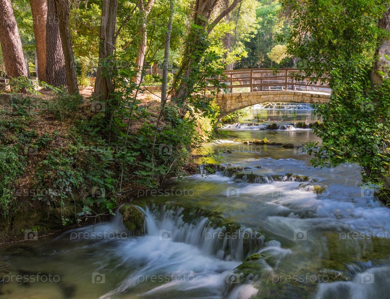 Красивый небольшой ручей с порогами. Каменный мост. Национальный парк КРКА Хорватия, Европа
