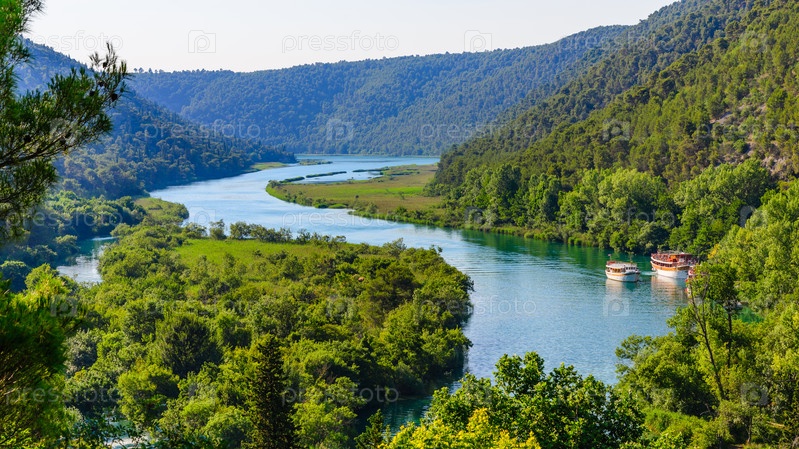 Вечерний вид на реку КРКА с водопада Скардинский Бук. Национальный парк КРКА Хорватия, Европа