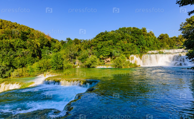 Красивый каскад водопадов на реке КРКА во время заката. Национальный парк КРКА Хорватия, Европа