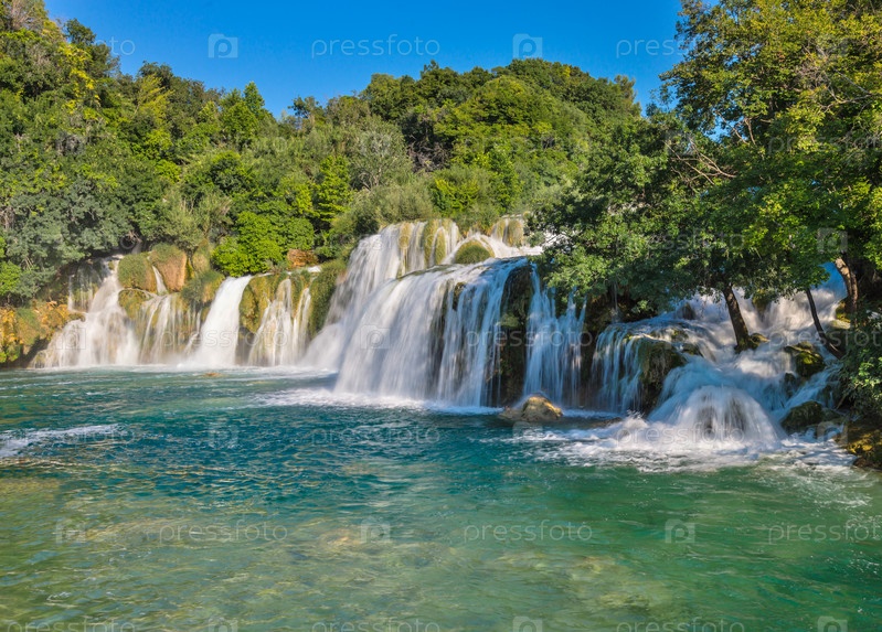 Нижний водопад Скрадински Бук в солнечный день. Национальный парк Крка, Хорватия