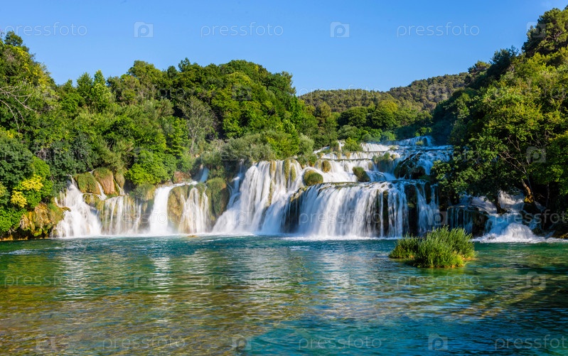 Нижний каскад водопадов Скрадински Бук в солнечный день. Национальный парк КРКА Хорватия, Европа
