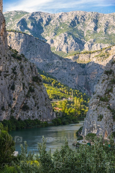 Пейзаж каньона реки Цетины от Омиша. Солнечный день. Хорватия, Европа