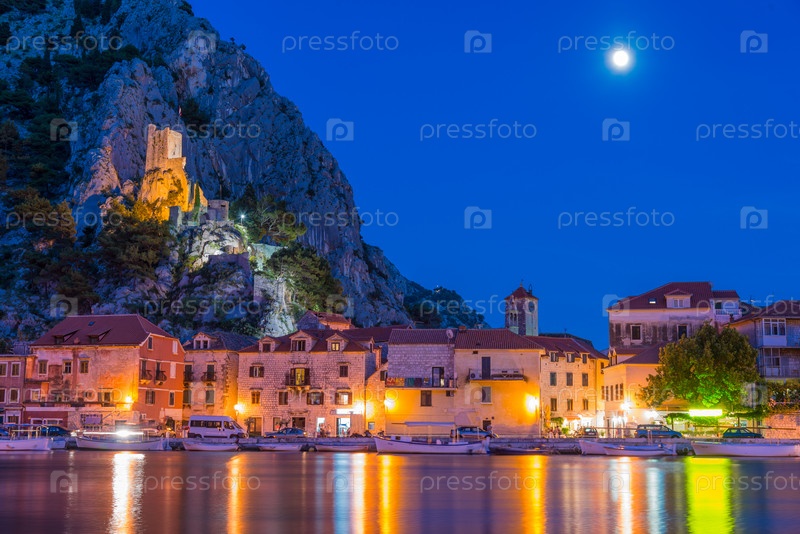 Омиш Пейзаж на закате с луной и отражением. Хорватия, Европа