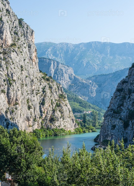 Пейзаж каньона реки Цетины от Омиша. Вертикальная рамка. Хорватия, Европа