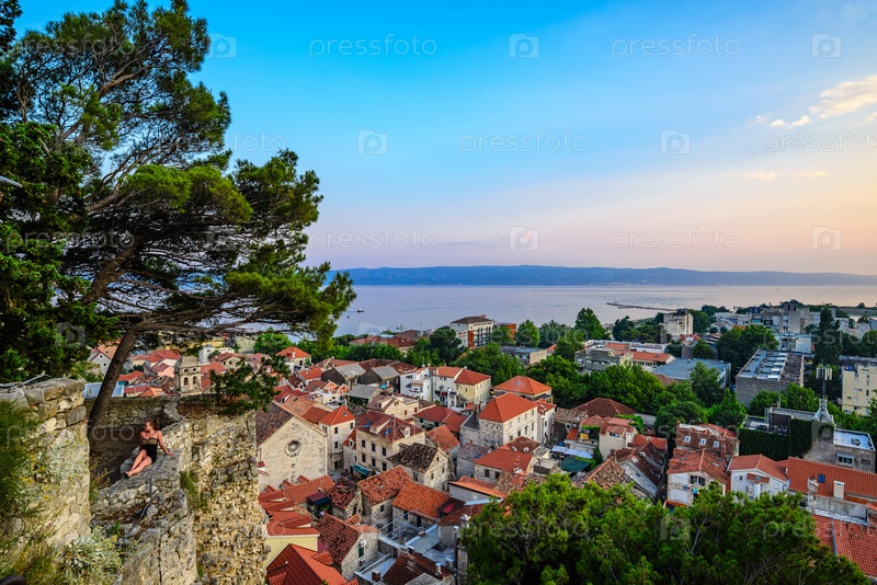 Вечерний вид на Омиш с крепости Мирабелла. Омиш, Хорватия, Европа