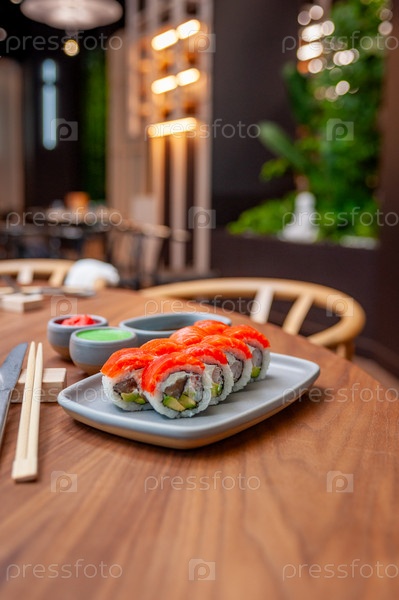 Суши-ролл с лососем, креветками, авокадо и сливочным сыром на тарелке