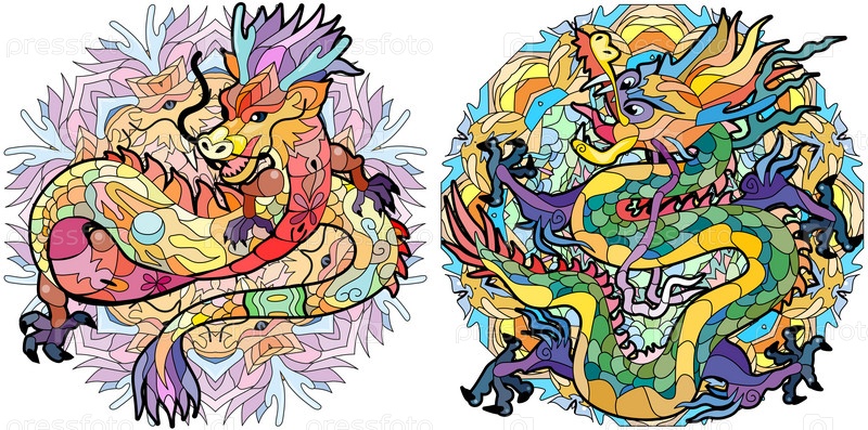 Зантегле драконы на мандале. ручно нарисованная декоративная векторная иллюстрация