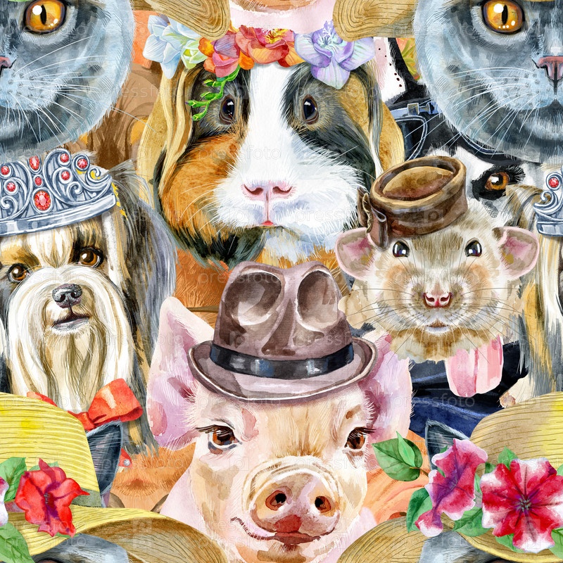 Бесшовный рисунок собаки, морской свинки, кошки, мини-свиньи и крысы. Иллюстрация акварельных домашних животных. Акварель рисованной иллюстрации