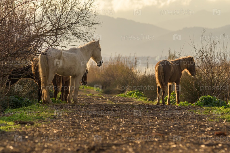 Группа лошадей на свободе на закате, молодые и взрослые в стаде, Майорка, Балеарские острова, Испания,