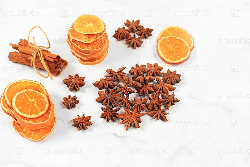 Кухонный фон, композиция с традиционными зимними специями для повышения иммунитета в холодный период. Бадьян, корица, сушеные апельсины и мандарины с еловыми ветками. Концепция кануна Нового года и Рождества,
