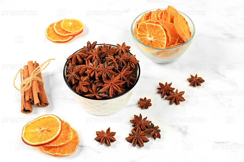 Кухонный фон, композиция с традиционными зимними специями для повышения иммунитета в холодный период. Бадьян, корица, сушеные апельсины и мандарины с еловыми ветками. Концепция кануна Нового года и Рождества,