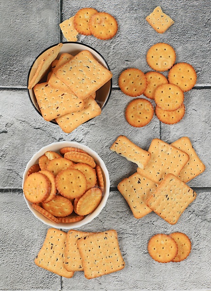 Сухой французский крекер с кунжутом на бетонном фоне. Домашнее безглютеновое шоколадное печенье и ореховое печенье, современная концепция пекарни. Здоровый завтрак с ингредиентами, вид сверху,