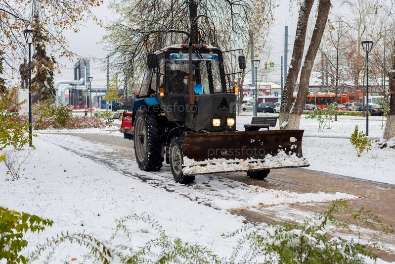 Трактор чистит городской сквер от снега