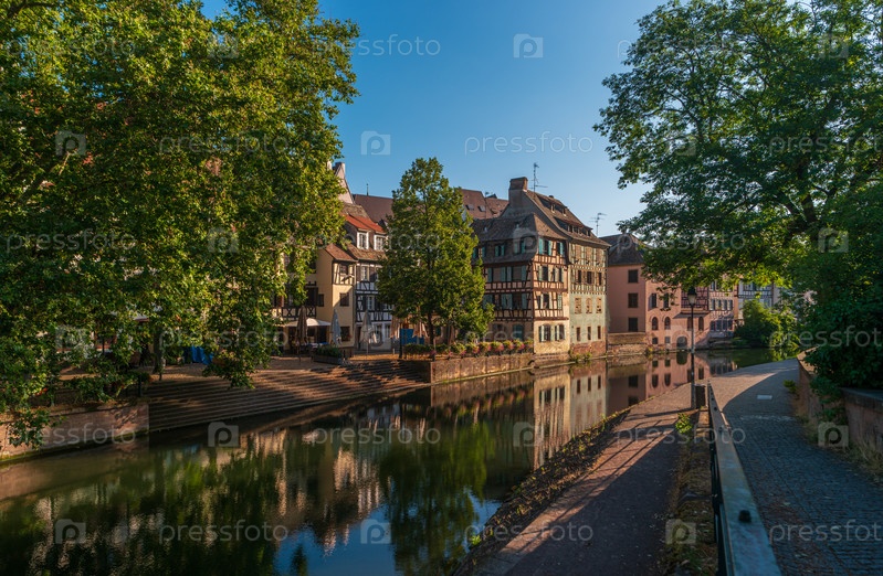Страсбург, Франция. Старинные дома района Маленькая Франция на набережной реки Иль ранним утром