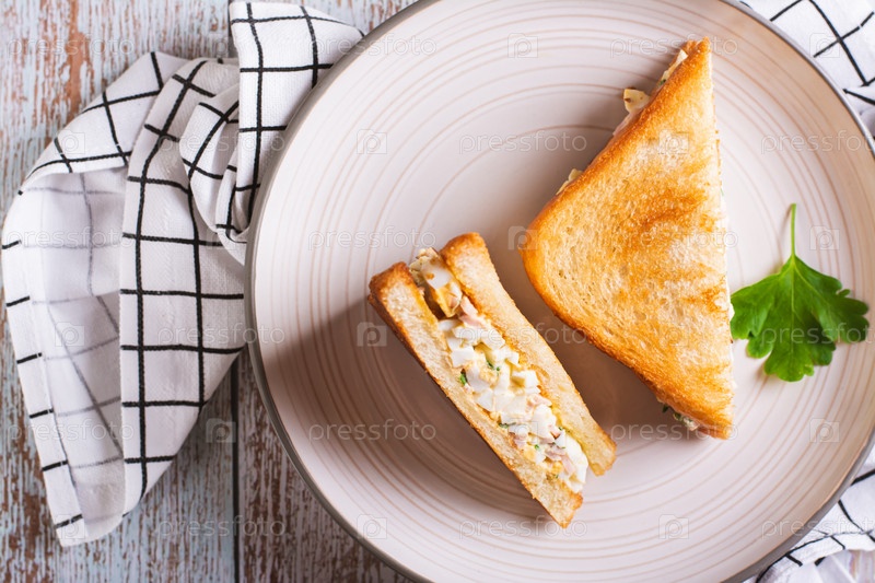 Крупный план нарезанных бутербродов с яйцом, беконом и салатом из трав на тарелке на столе