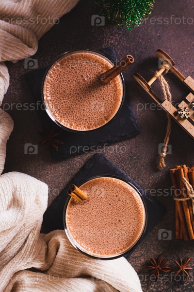 Домашний пьяный праздничный эгг-ног с корицей в стаканах на столе и вертикальный вид