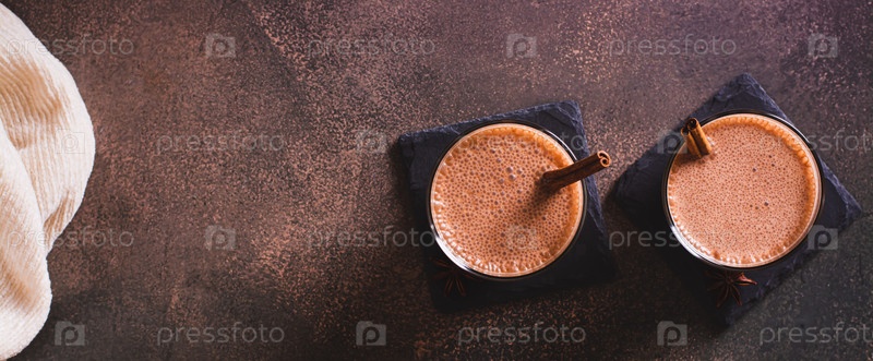 Домашний пьяный праздничный эгг-ног с корицей в стаканах на столе, вид веб-баннера
