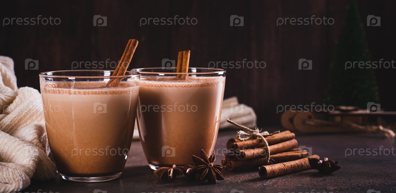 Шоколадный рождественский эгг-ног со специями в стаканах на столе веб-баннер