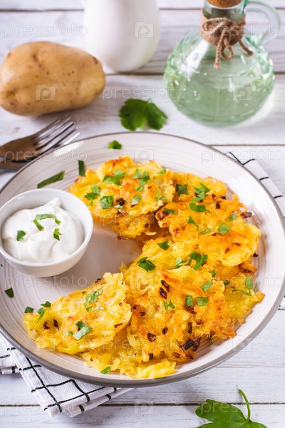 Традиционные картофельные латкес с зеленью и соусом на тарелке на столе, вертикальный вид