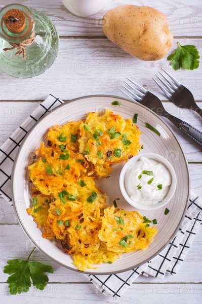Традиционные картофельные латкес с зеленью и соусом на тарелке на столе и вертикальный вид