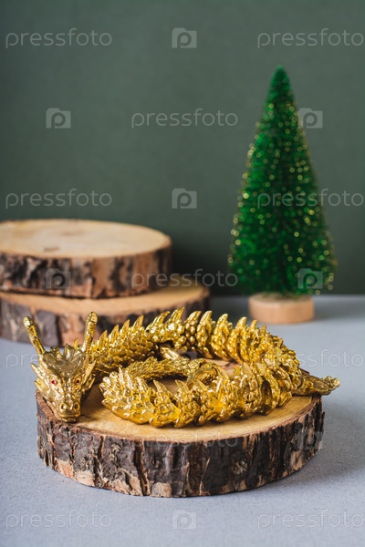 Металлический дракон на срезанном дереве и ель на зеленом фоне для вертикального просмотра китайского Нового года