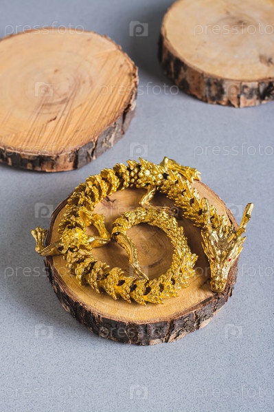 Металлический золотой дракон, свернувшийся на срезе дерева на сером фоне, вертикальный вид