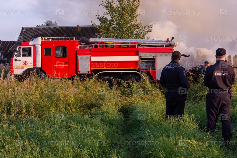 На место прибыли сотрудники пожарной службы. Пожарная машина на месте пожара. Пожар в деревне. Горят деревянные дома в селе. На месте предприятия промышленности работают сотрудники пожарной службы. Пожарная машина на месте пожара. Пожар в деревне. Горящие