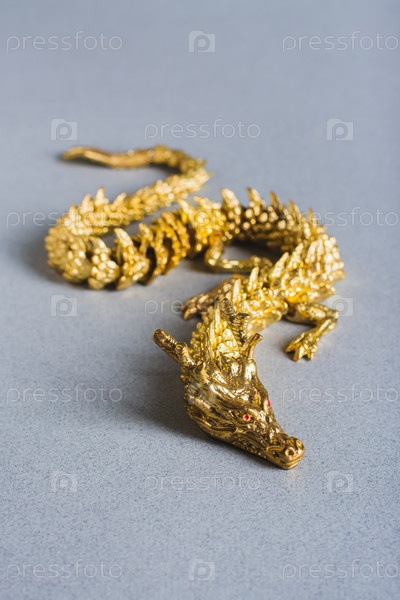Золотой металлический дракон на сером фоне декора для китайского Нового года, вертикальный вид