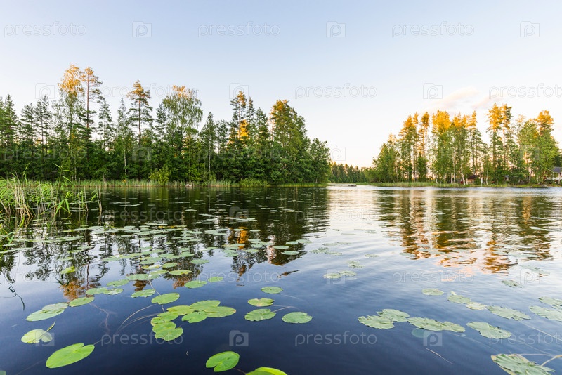 Пейзажное озеро с кувшинками на закате. Озеро Хаукивеси, Финляндия