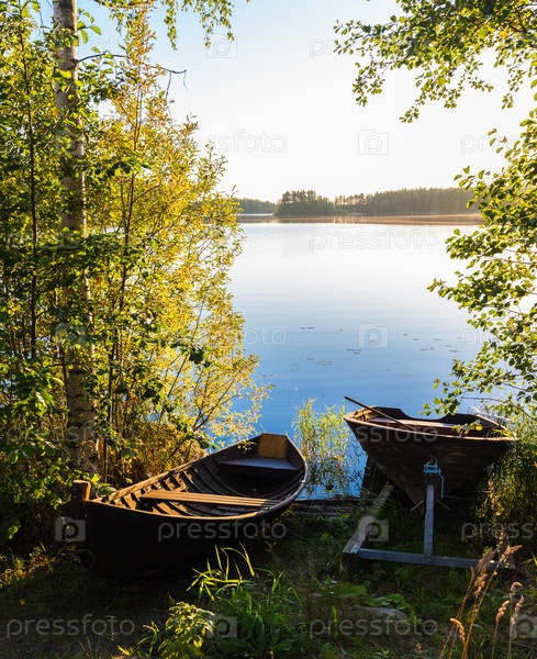 Пейзаж озера с лодкой на переднем плане. Озеро Хаукивеси, Финляндия