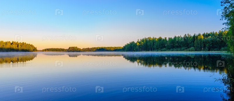 Красивый панорамный вид на озеро Хаукивеси во время восхода солнца. Легкий туман над водой. Финляндия