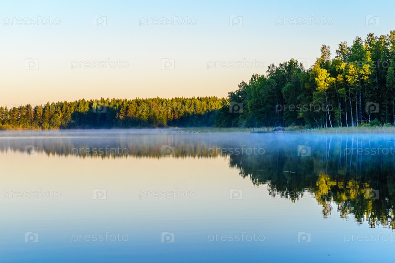 Восход солнца над озером Хаукивеси. Над водой туман. Озеро Хаукивеси, Финляндия