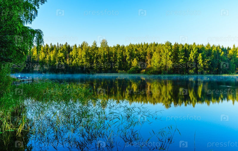 Красивый пейзаж озера Хаукивеси во время восхода солнца. Легкий туман над водой. Зеркальное отражение в воде. Система озер Сайма, Рантасалми, Саво, Финляндия