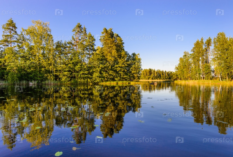 Вечерний вид на озеро Хаукивеси с отражением деревьев в воде. Озеро Хаукивеси, Финляндия