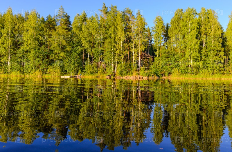 Берег озера отражается в воде. Озеро Хаукивеси, Финляндия