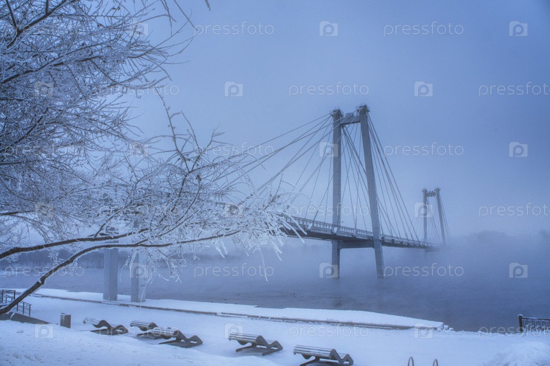 Морозное туманное зимнее утро над рекой Енисей в центре Красноярска