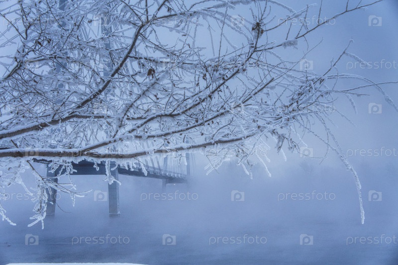 Морозное туманное зимнее утро над рекой Енисей в центре Красноярска