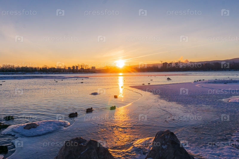 Зимнее морозное утро над Енисеем в центре Красноярска