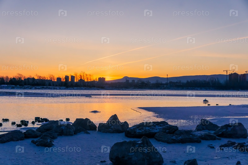 Зимнее морозное утро над Енисеем в центре Красноярска