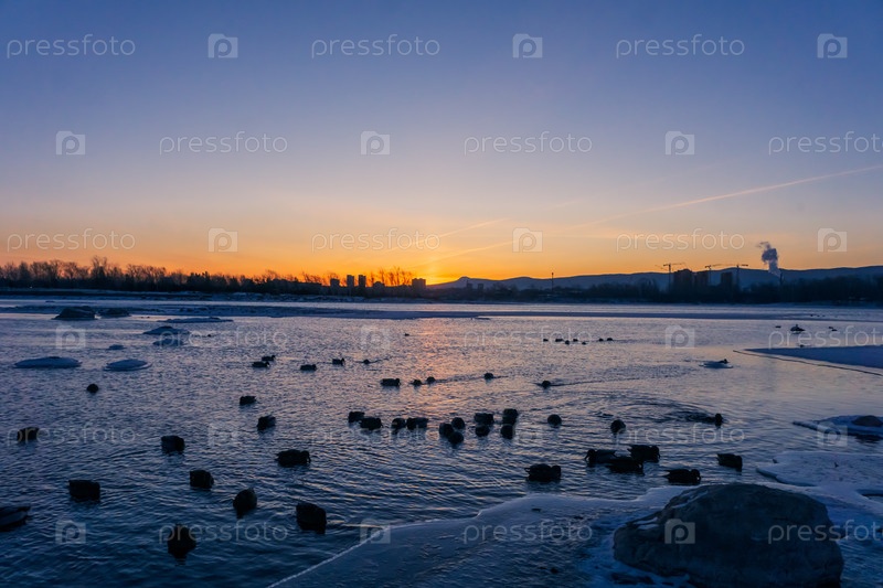Зимнее морозное утро над Енисеем в центре Красноярска