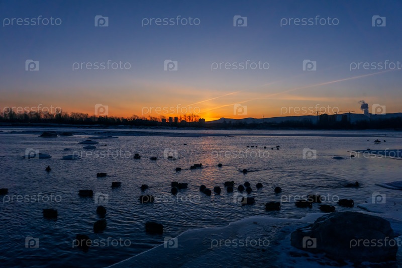 Зимнее морозное утро над Енисеем в центре Красноярска