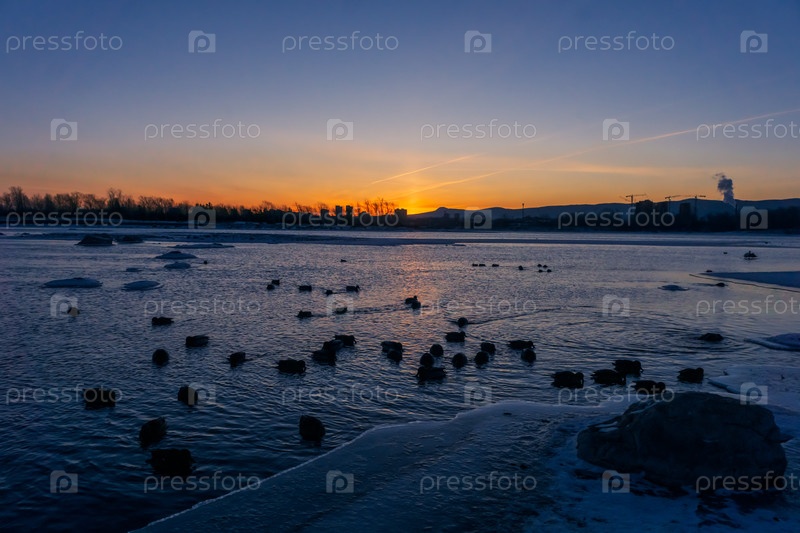 Зимнее морозное утро над Енисеем в центре Красноярска